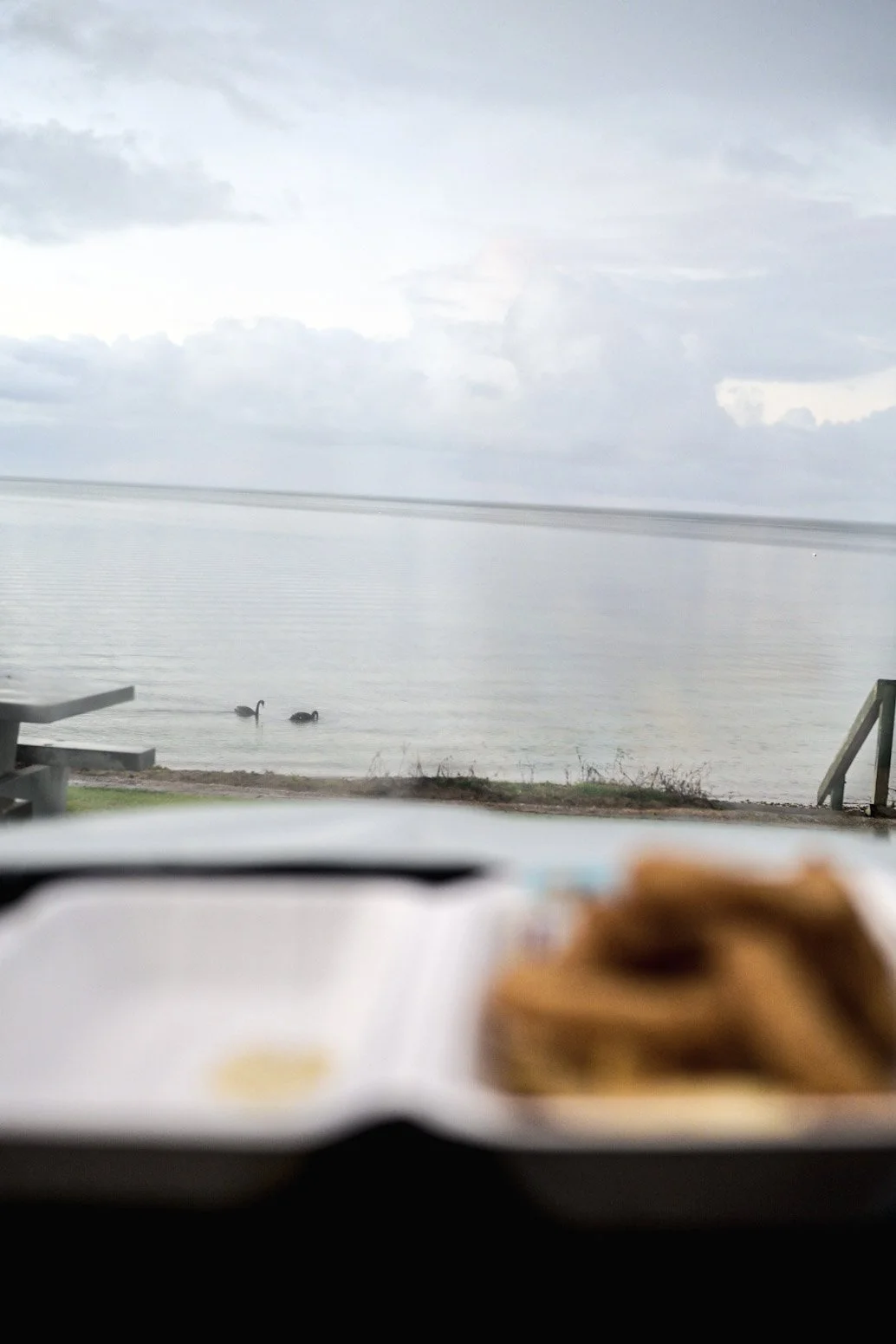 As we dug into our crispy calamari and golden chips, we couldn't help but soak in the breath-taking views. The foreshore provided a stunning backdrop, with graceful black swans gliding across the water under the glow of a setting sun. It was a scene straight out of a postcard, made even more magical when a light rain shower gifted us a vibrant rainbow.